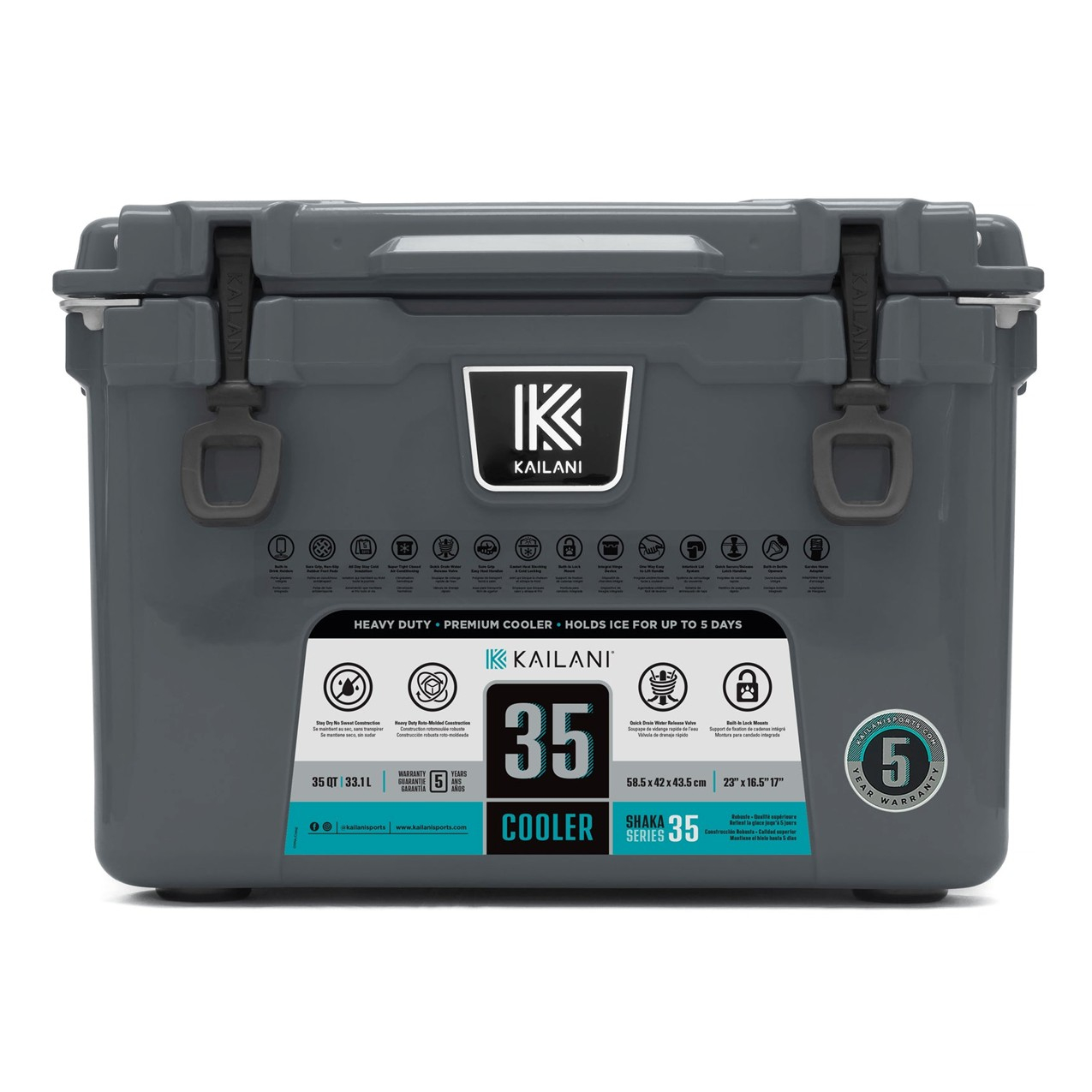 The ugged KAILANI SHAKA 35 Cooler. Our mid-size rotomolded cooler has a rugged and practical design that is perfect for any outing. This has a capacity of 35 quarts (33.1 liters) and can hold up to 56 cans plus ice.